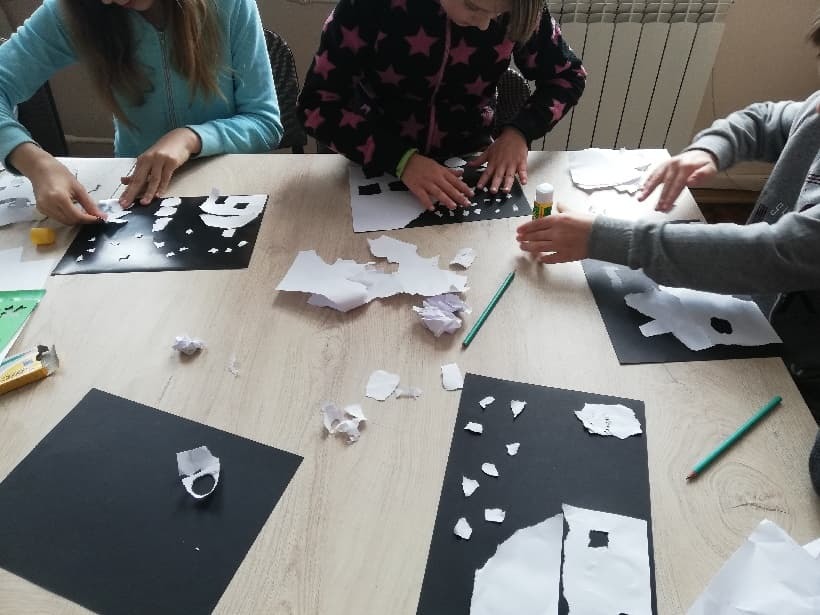 - „Świat w zimowej szacie” – wydzieranka z białej kartki na ciemnym tle