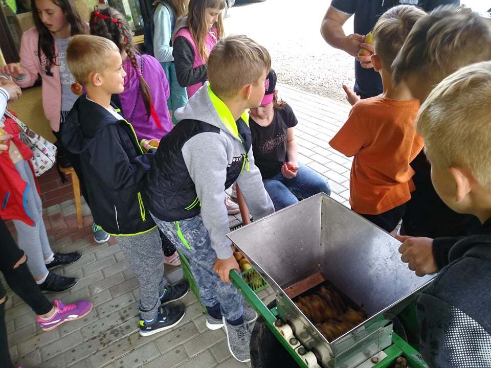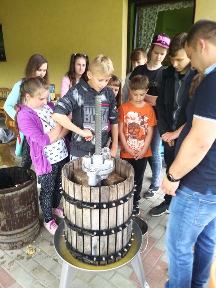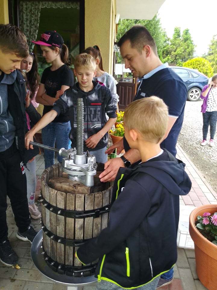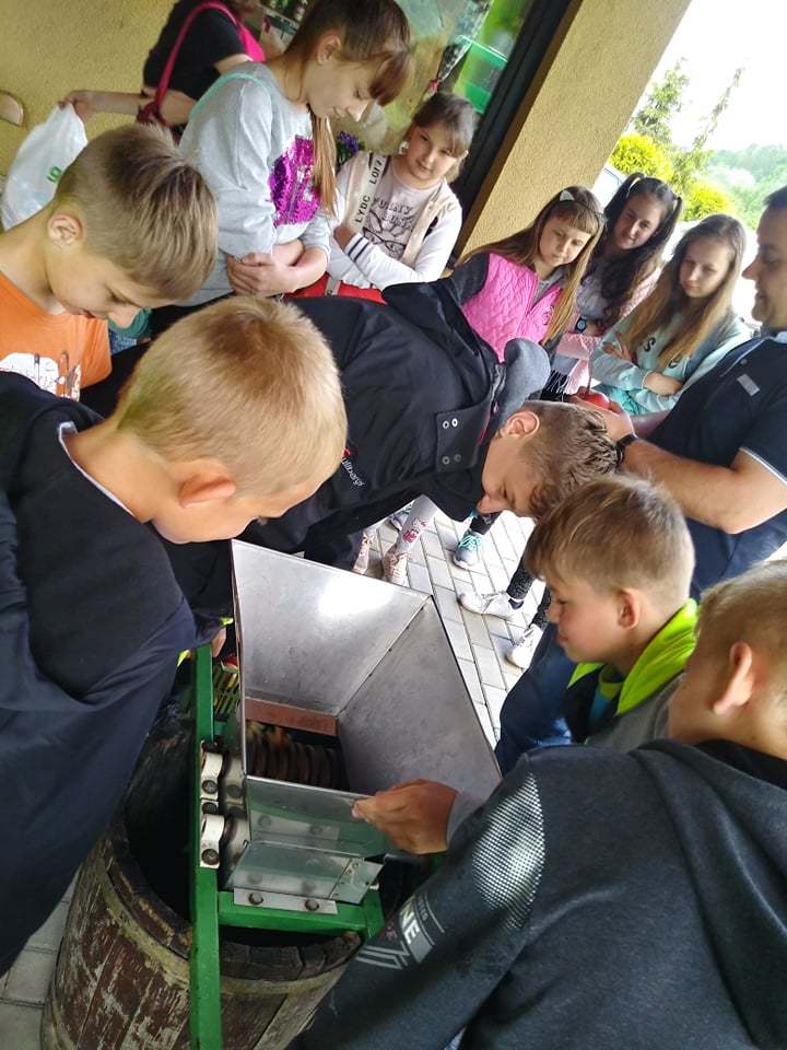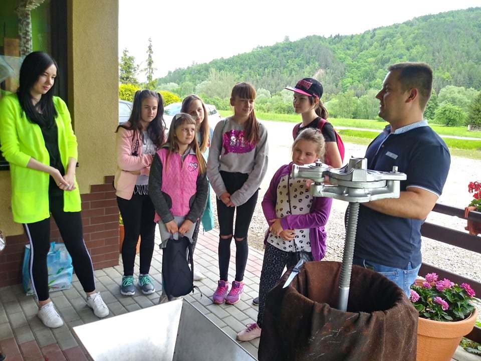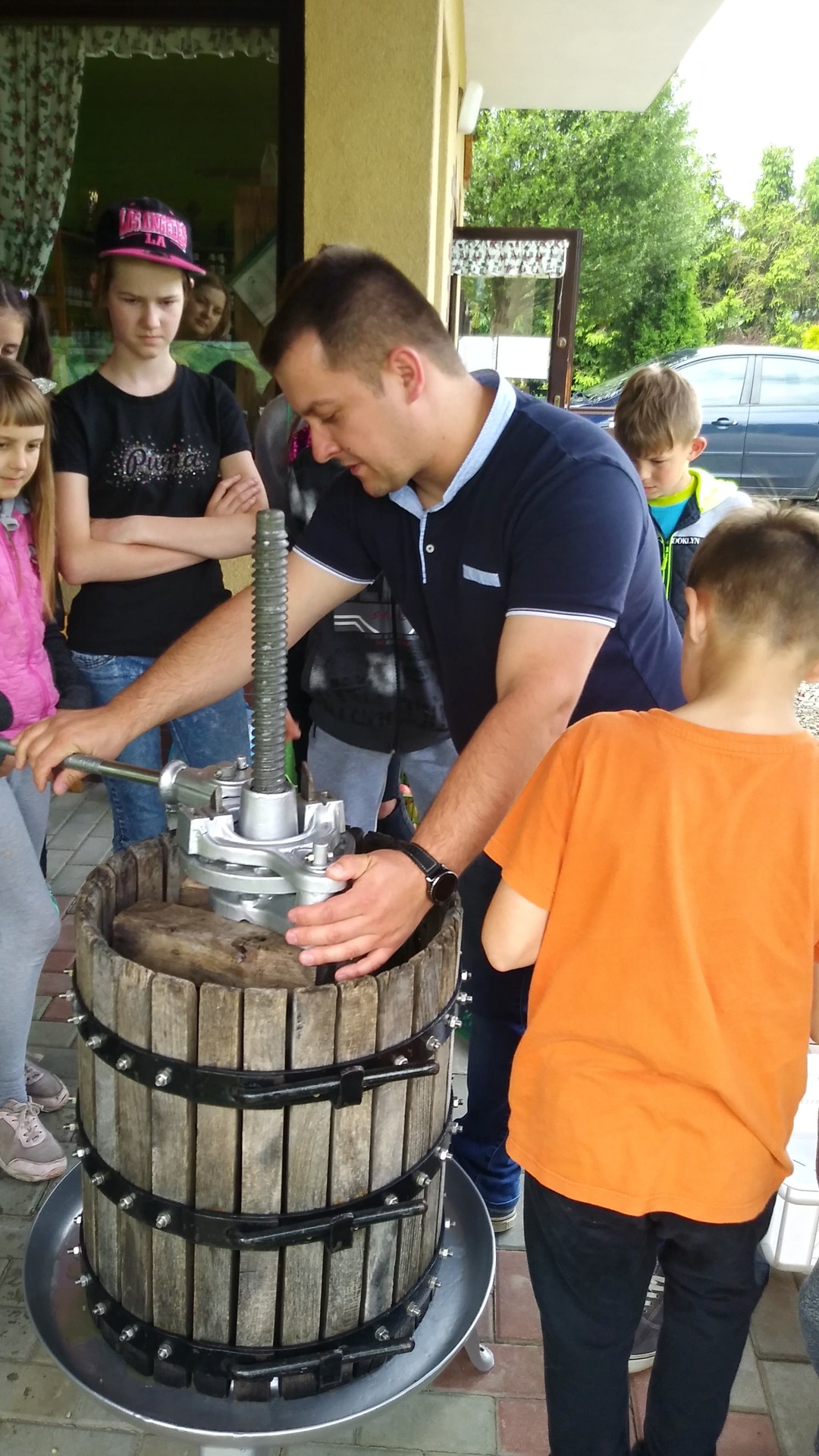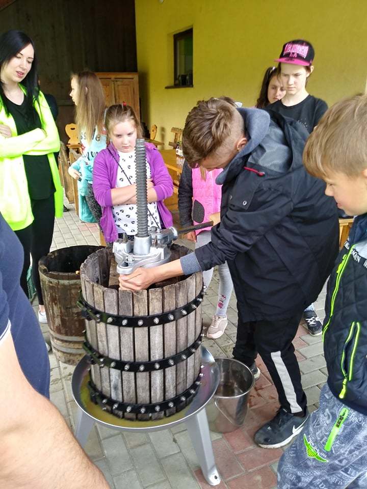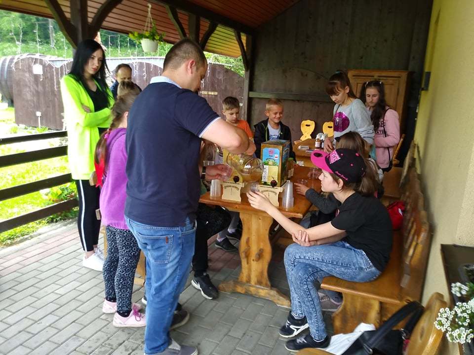 W obecności pracownika pijalni, który opowiadał o firmie i regionie mieliśmy okazję wypocząć w otoczeniu górskim. W ramach wycieczki zapewnione mieliśmy degustację soków owocowych, warzywnych i kiszonych oraz pokaz tłoczenia na ręcznej prasie. Dzieci miały możliwość samodzielnie wytłoczyć sok z jabłek pochodzących z okolicznych łąckich sadów. W świetnej atmosferze i pięknej pogodzie zorganizowaliśmy ognisko wraz z kiełbasą.